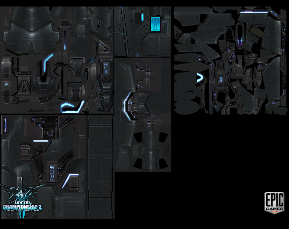 Unreal Championship 2 was my first title shipped at Epic Games. I feel super lucky to have UC2 as my first shipped title, the team we had at Scion Studios was absolutely incredible and I am extremely grateful of the guys who took a chance on the goofy looking college kid amongst seasoned industry vets, and welcomed me as a part of the team. UC2 is an amazing game that unfortunately was a little too late in the Xbox cycle, and too early for Xbox 360. I highly recommend playing it, its a fast paced, jumpy, crazy 3rd/1st person hardcore type shooter. Check out this awesome youtube video if you're unfamiliar with the game, this youtube user has very nice things to say. We had a small team working on this game, I was able to wear many hats, and learn and gain experience in may areas outside my comfort zone. I created a set of tiling wall, floor, trim, and deco environment textures for the high tech Egyptian environments, as well as textures for a majority of the meshes throughout the levels. I was also responsible for the UI, created layouts based on initial concept art, animated the UI, captured and edited video for weapon, character, and map portraits, created character portraits - lit/paint-touch up models(textures by Lee Dotson and Kendall Tucker), HUD design, and animated crosshairs. I was also involved with our cinematics, in doing After Effects motion graphics/design in post for the news room shots and other misc shots, as well as creating the news-room environment background (512 video texture of 128x128 gameplay videos on rotating tv meshes). Apologies for the super crappy camera-phone photos of the levels, the game is fairly old and had a hard time finding good screenshots of the levels, and was unsuccessful in getting the old build running. Unreal Championship 2: The Liandri Conflict was released on the Xbox. |